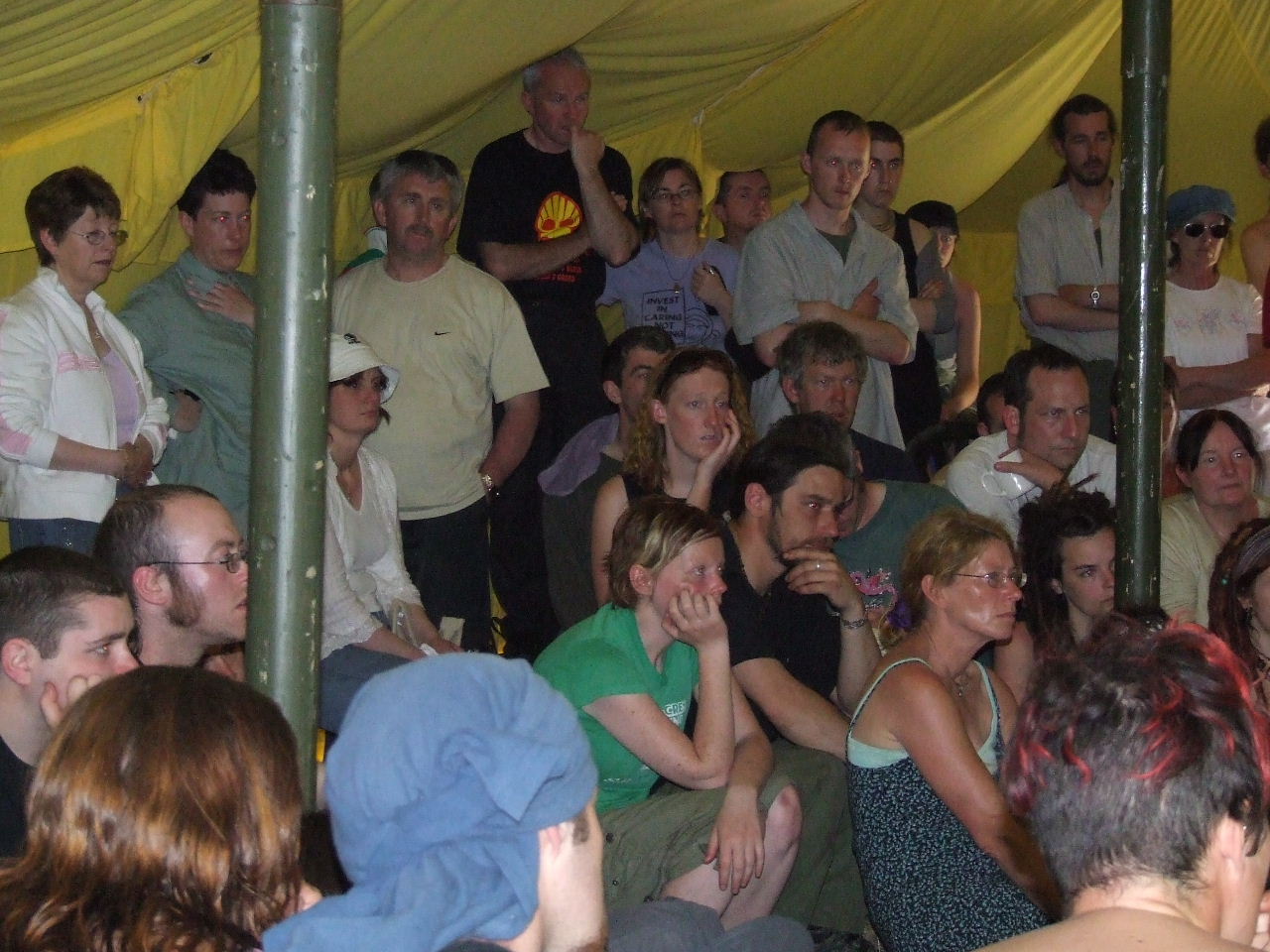 Attentive audience for Jose from Bolivia at the camp to talk about grassroots social movements and resistance to privatisation of natural resources there.