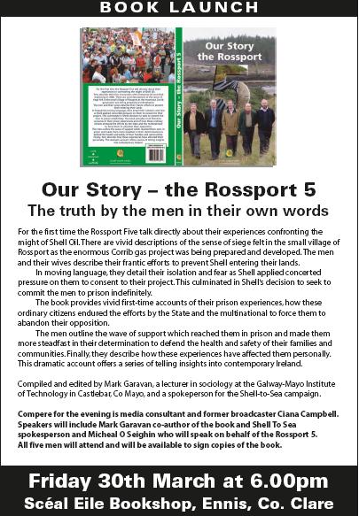 The Clare Region launch of the book "Our Story The Rossport 5" will take place on Friday March 30th at 6.00 pm in Sceal Eile bookshop in Ennis.
